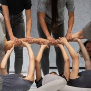 La troisième partition sera un espace d’invention qui sera créé avec les danseuses et danseurs. Basé sur une pratique chorégraphique de groupe avec 6 personnes en contact et en réciprocité, la composition se fera en portés et en miroir. Il s’agit de partager une part de son propre poids, mais pas tout le poids avec les autres. Il s’agit, en métaphore, de donner à voir la manière dont nous sommes construits étroitement dans des liens, dans un tissu humain. Nous nous portons littéralement les uns et les autres. C’est une structure de groupe assez complexe qui suscite une intelligence collective pour résoudre les entremêlements de manière consensuelle, en considérant le rôle de chacun et sans destruction de la structure.